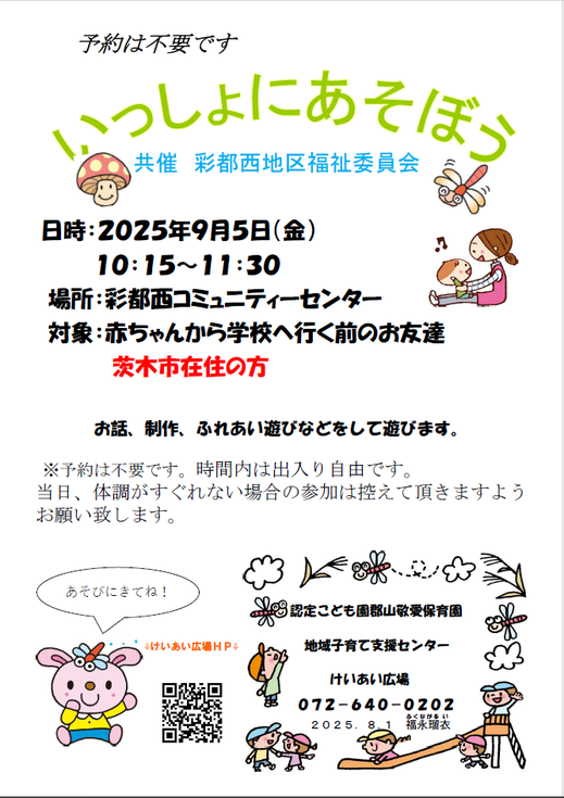 子育てサロン(いっしょにあそぼう)を開催します(9/5)